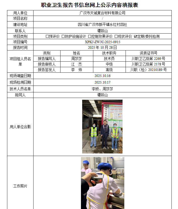 广汉市天诚复合材料有限公司职业病危害因素定期检测