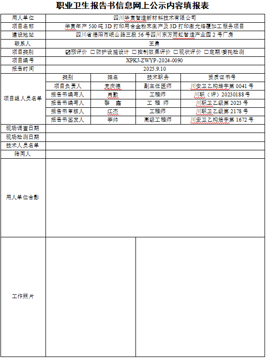 四川华寅智造新材料技术有限公司职业病危害因素预评价