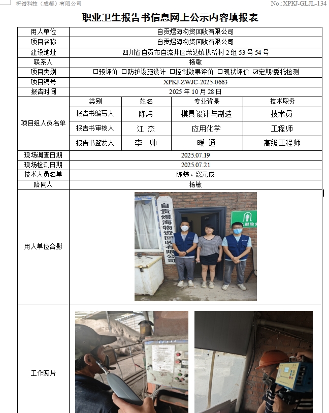 自贡煜海物资回收有限公司职业病危害因素定期检测