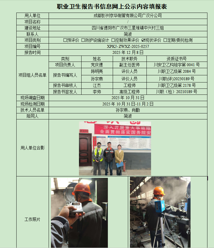 成都彭州京华制管有限公司广汉分公司职业病危害现状评价