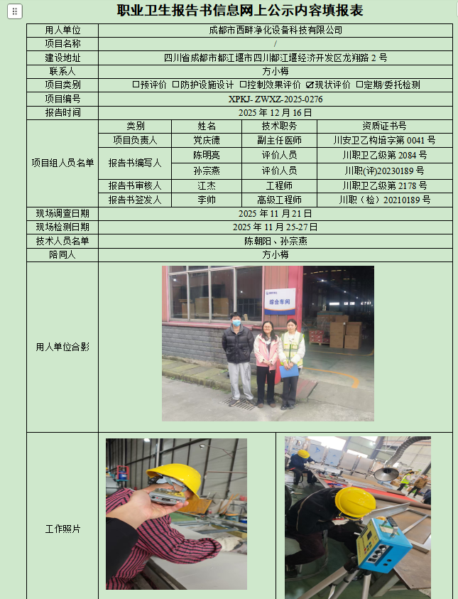 成都市西畔净化设备科技有限公司职业病危害现状评价
