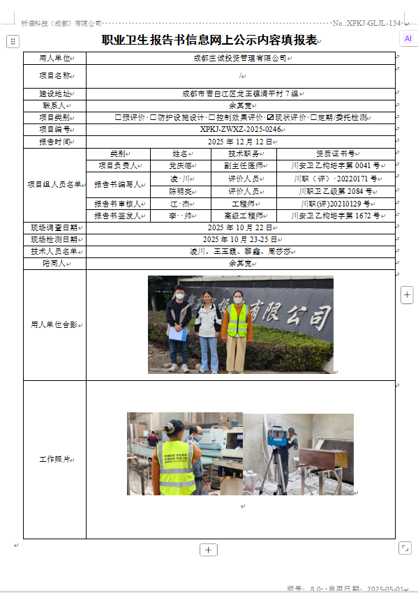 成都庄诚投资管理有限公司职业病危害现状评价