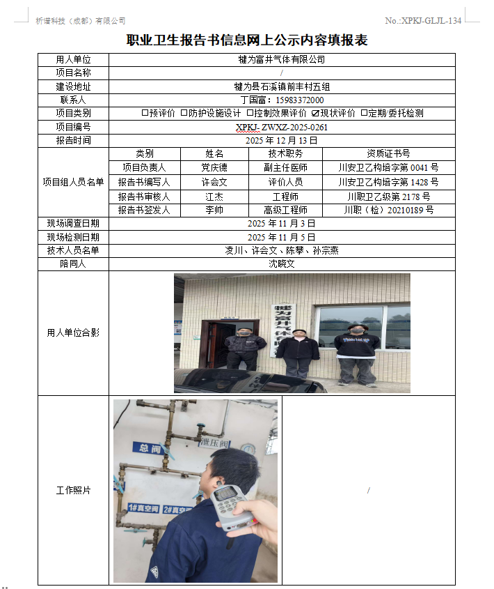 犍为富井气体有限公司职业病危害现状评价