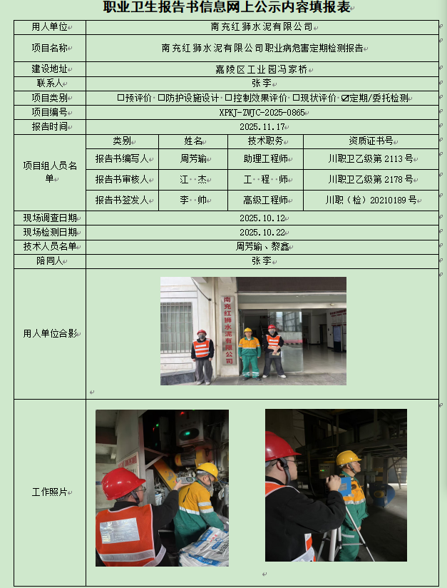 南充红狮水泥有限公司职业病危害因素定期检测