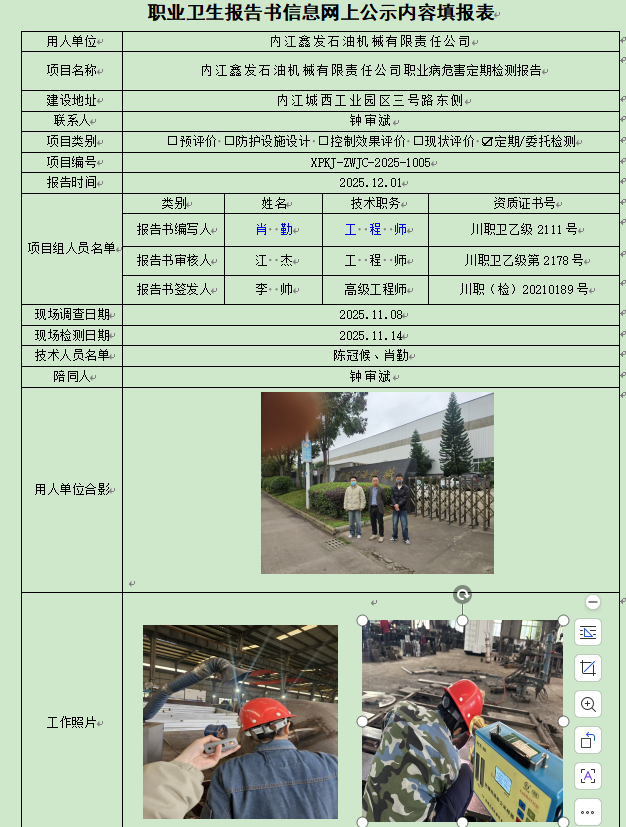 内江鑫发石油机械有限责任公司职业病危害因素定期检测
