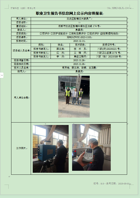 双流区彭镇双兴家具厂职业病危害因素定期检测