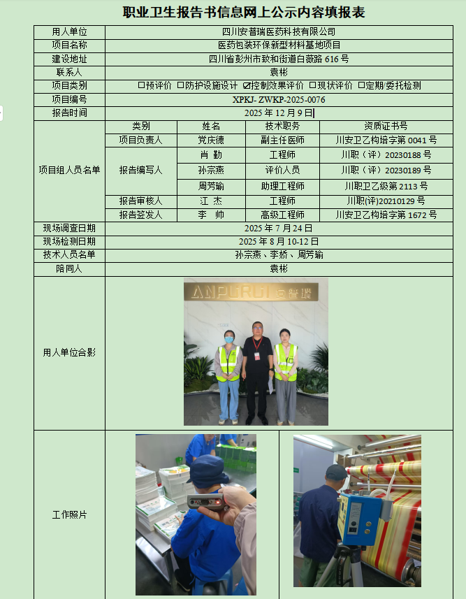 四川安普瑞医药科技有限公司职业病危害控制效果评价