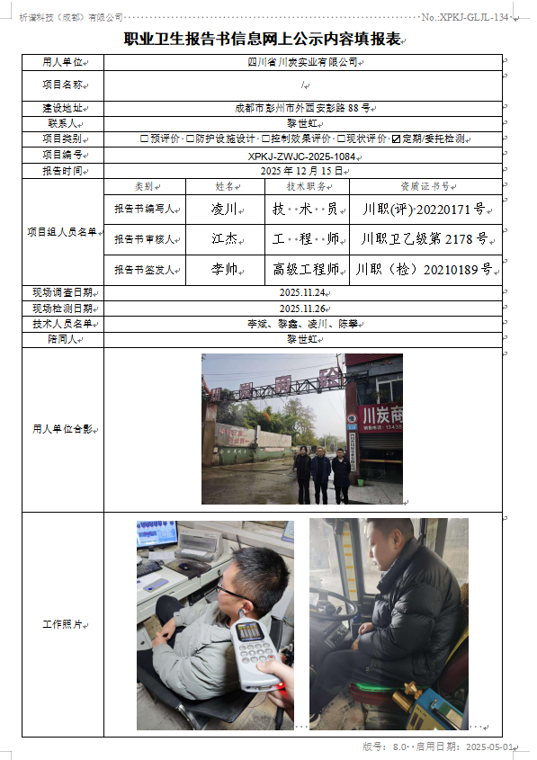四川川炭实业有限公司职业病危害因素定期检测