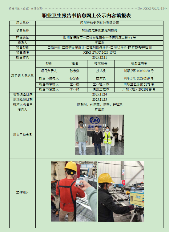 四川帝航安防科技有限公司职业病危害因素定期检测