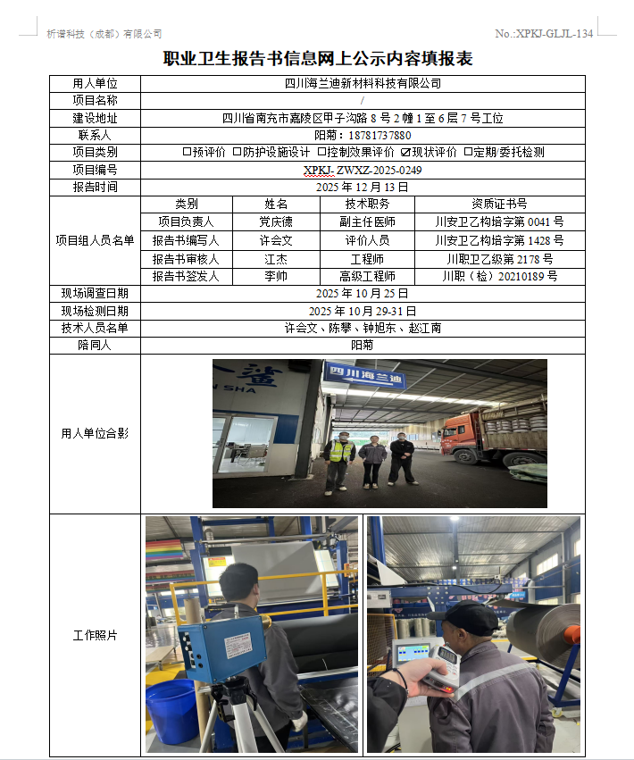 四川海兰迪新材料科技有限公司职业病危害现状评价