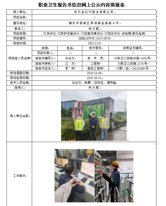 四川金红叶纸业有限公司职业病危害因素定期检测
