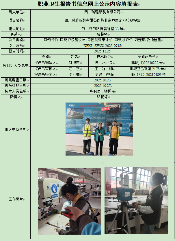 芦山雅诚纺织品有限公司职业病危害因素定期检测