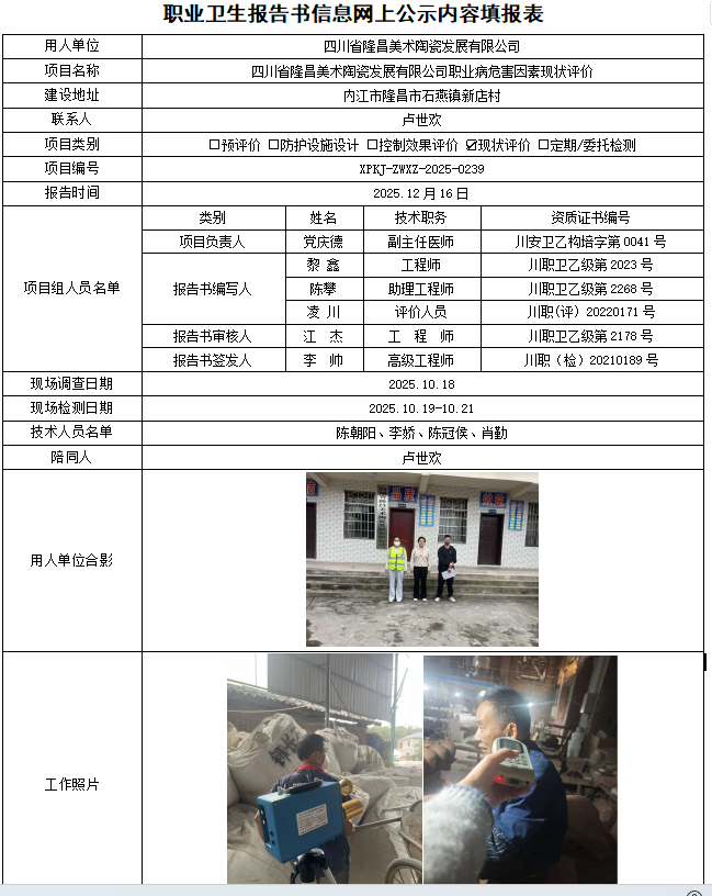 四川省隆昌美术陶瓷发展有限公司职业病危害现状评价