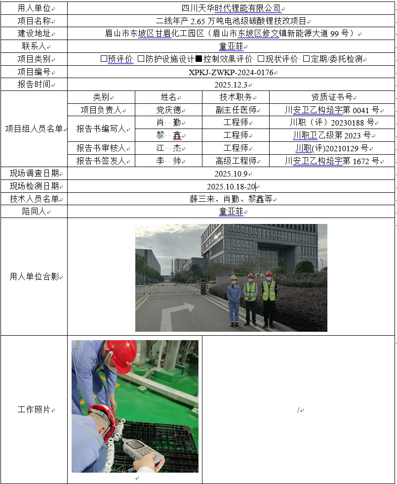 四川天华时代锂能有限公司职业病危害控制效果评价