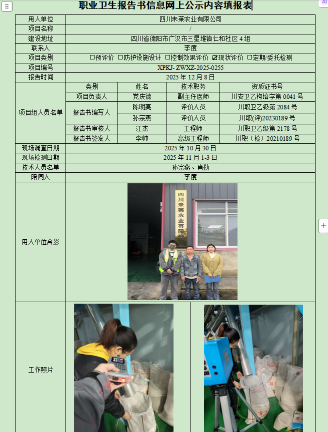 四川未莱农业有限公司职业病危害现状评价