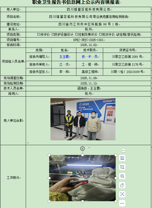 四川雄富蕊能科技有限公司职业病危害因素定期检测
