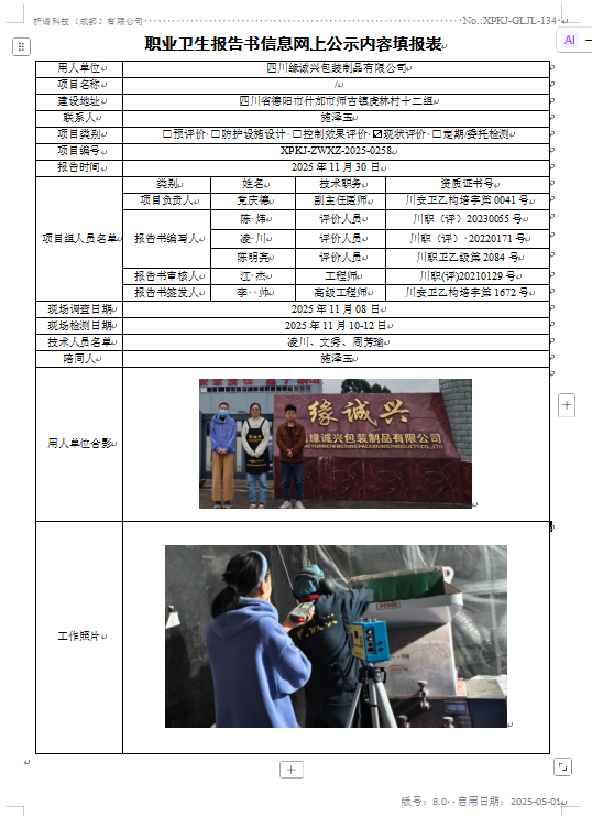四川缘诚兴包装制品有限公司职业病危害现状评价