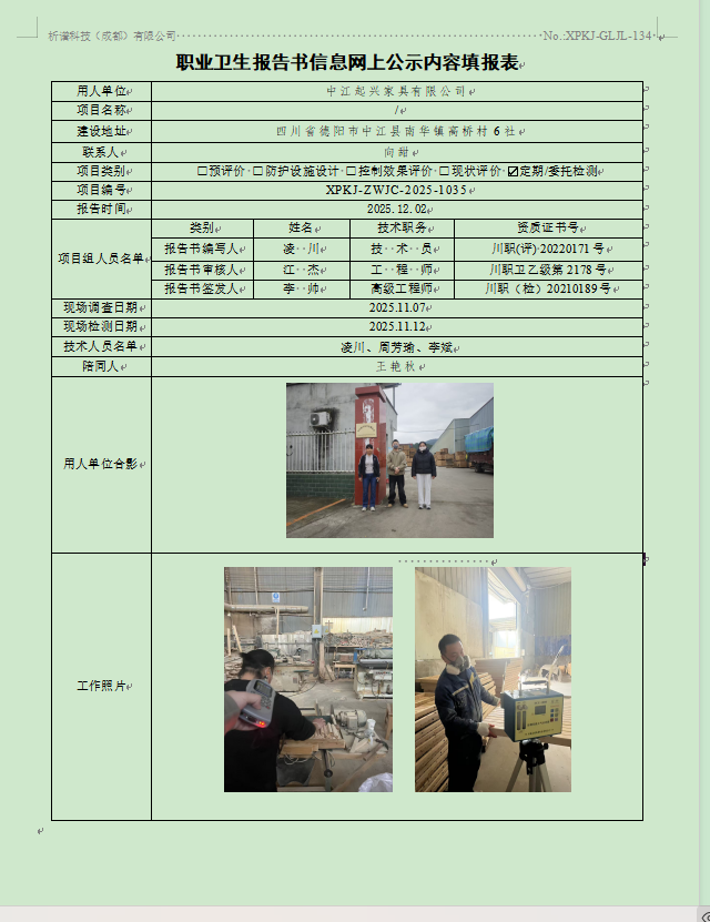 中江起兴家具有限公司职业病危害因素定期检测