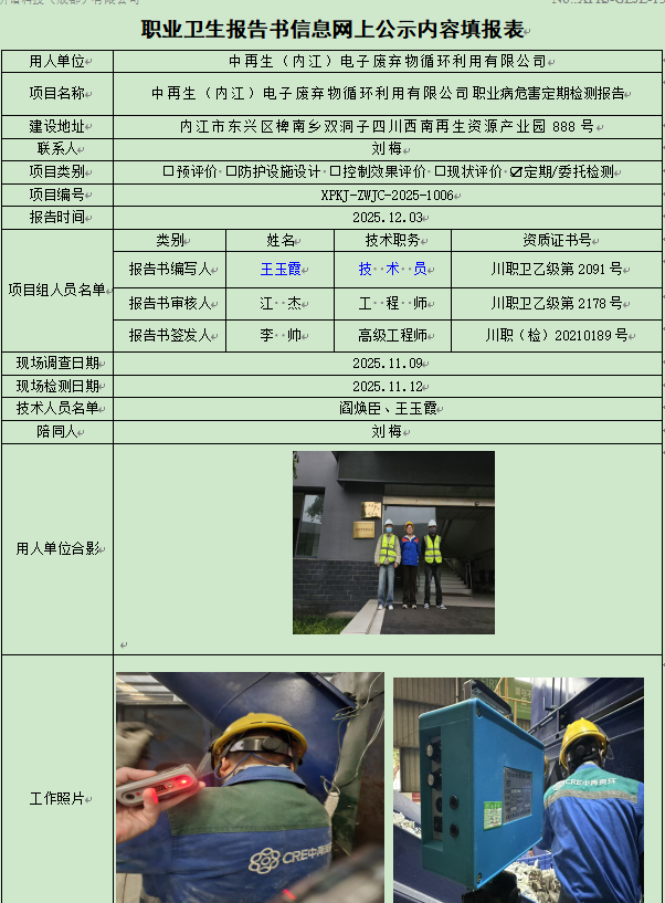 中再生(内江)电子废弃物循环利用有限公司职业病危害因素定期检测