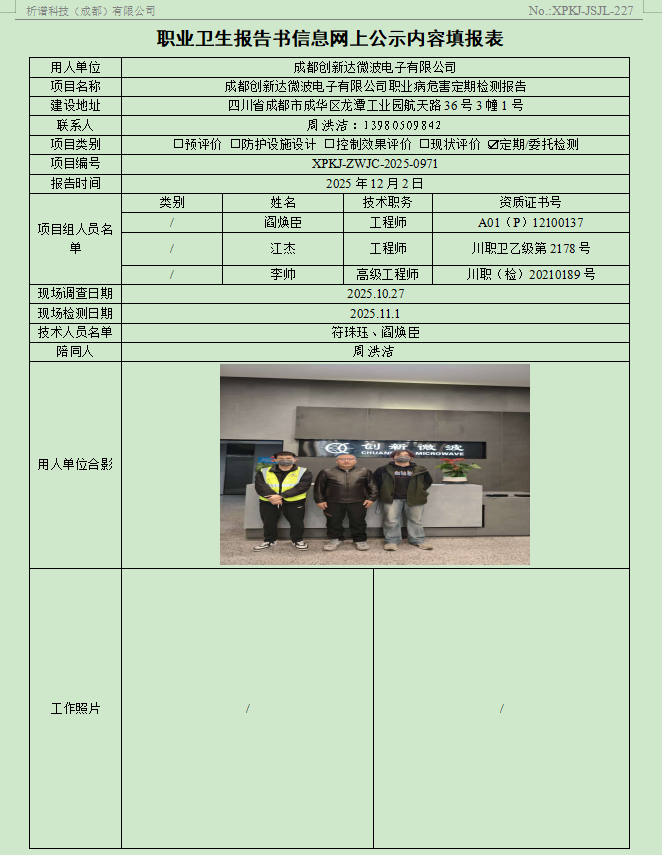 成都创新达微波电子有限公司职业病危害因素定期检测