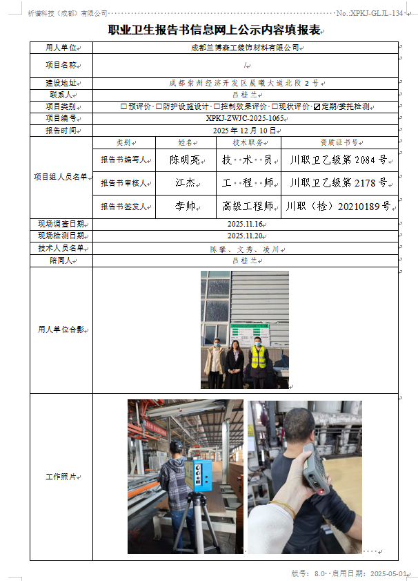 成都兰博森工装饰材料有限公司职业病危害因素定期检测
