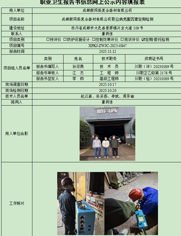 成都新同高复合器材有限公司职业病危害因素定期检测