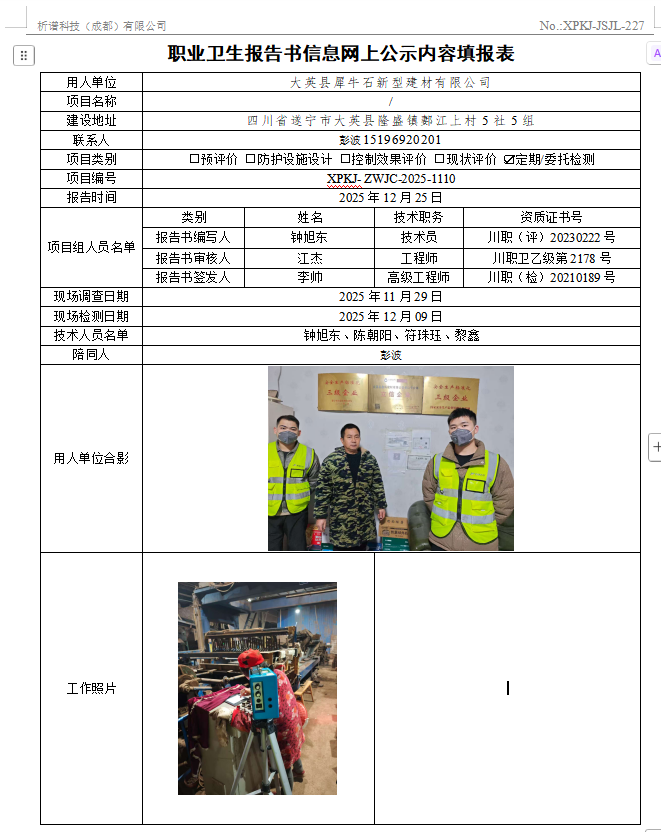 大英县犀牛石新型建材有限公司职业病危害因素定期检测