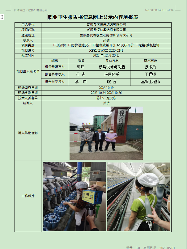富顺县恒信昌纺织有限公司职业病危害现状评价