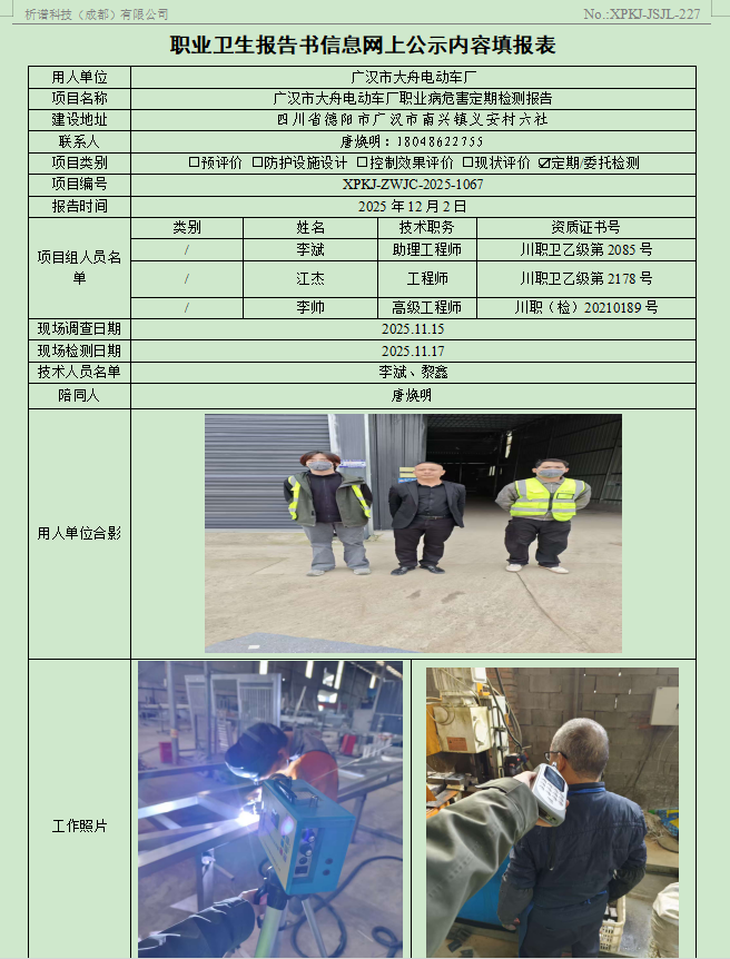 广汉市大舟电动车厂职业病危害因素定期检测