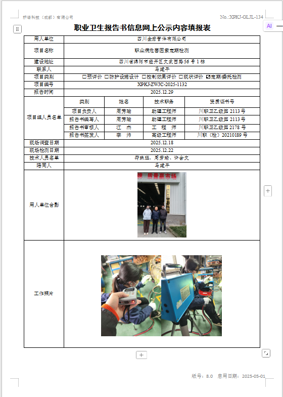 四川金宏管件有限公司职业病危害因素定期检测