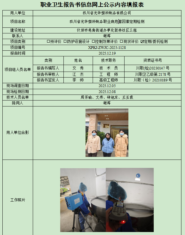 四川省光华塑料制品有限公司职业病危害因素定期检测