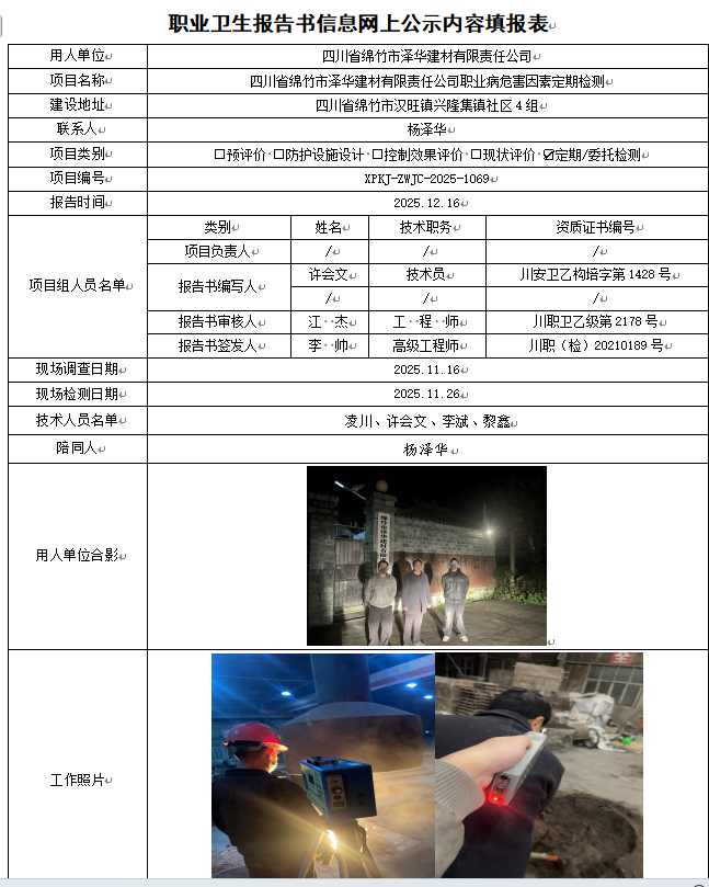 四川省绵竹市泽华建材有限责任公司职业病危害因素定期检测