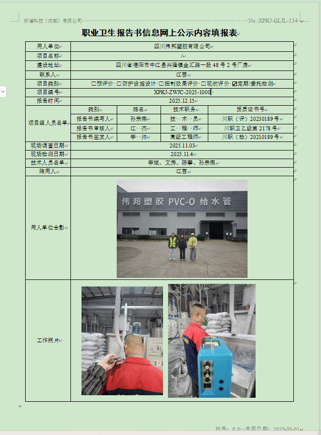 四川伟邦塑胶有限公司职业病危害因素定期检测