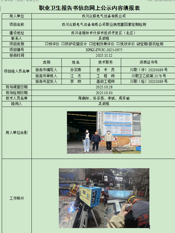 四川元泰健康科技有限公司职业病危害因素定期检测