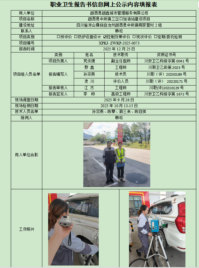 越西县越鑫城市管理服务有限公司职业病危害控制效果评价