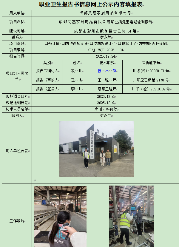 成都艾高家居用品有限公司职业病危害因素定期检测