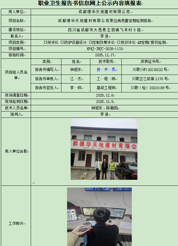 成都瑞芬思德丹生物科技有限公司职业病危害因素定期检测