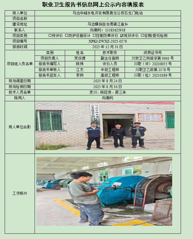 马边华峰水电开发有限责任公司石龙门电站职业病危害现状评价