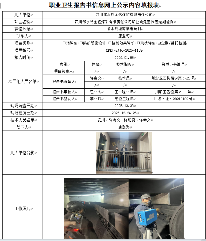 四川邻水县金亿煤矿有限责任公司职业病危害因素定期检测