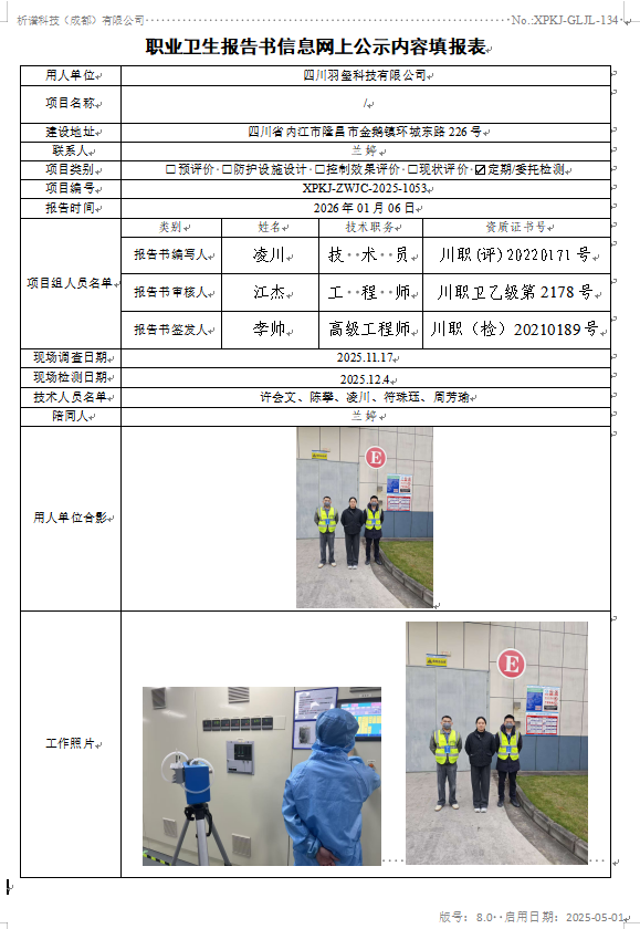 四川羽玺新材料股份有限公司职业病危害因素定期检测