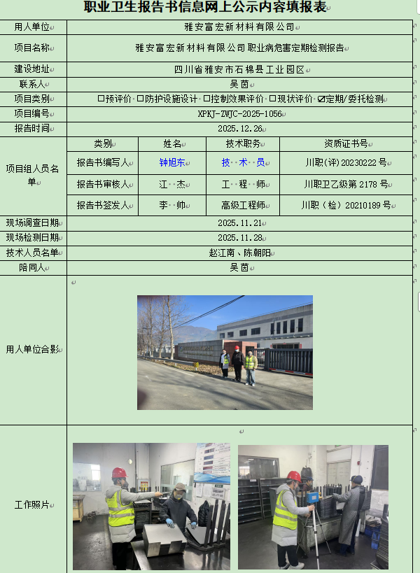 雅安富宏新材料有限公司职业病危害因素定期检测