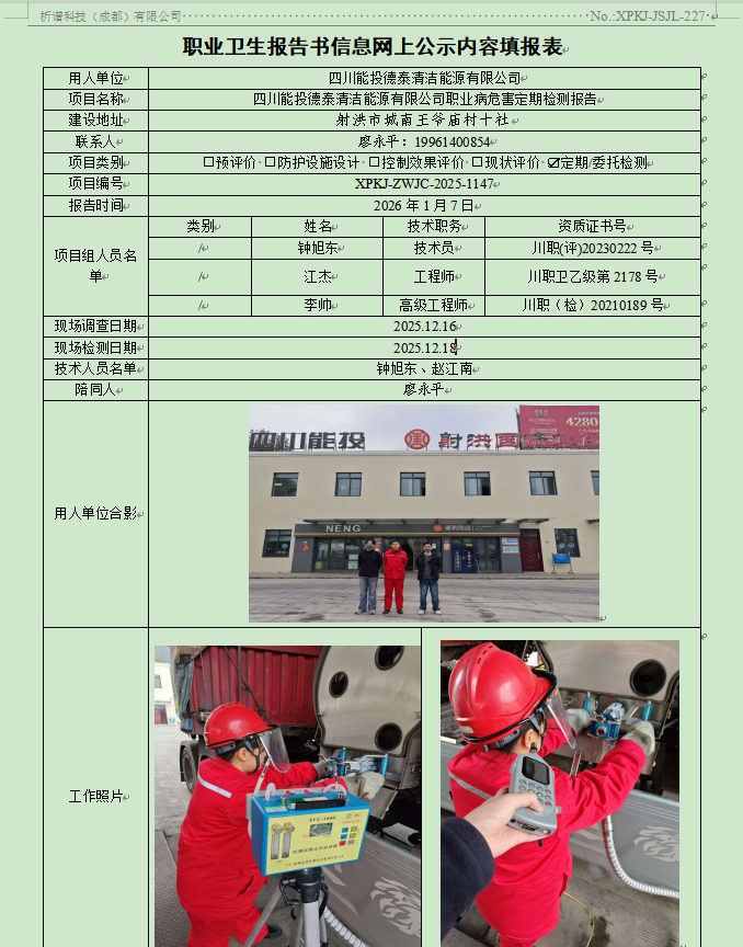 四川能投德泰清洁能源有限公司职业病危害因素定期检测