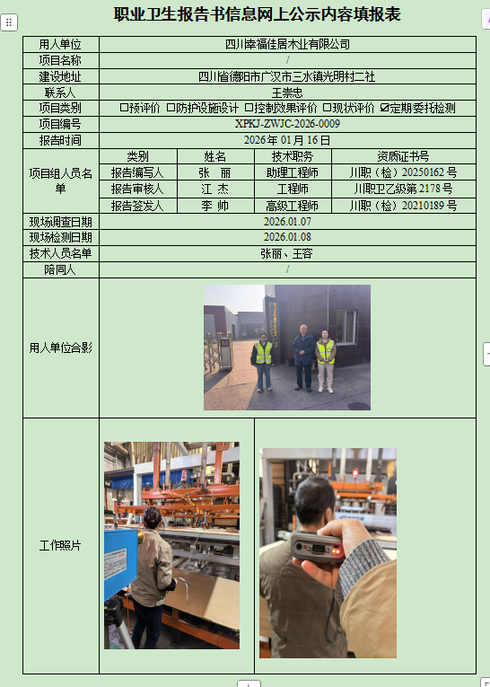 四川幸福佳居木业有限公司职业病危害因素定期检测