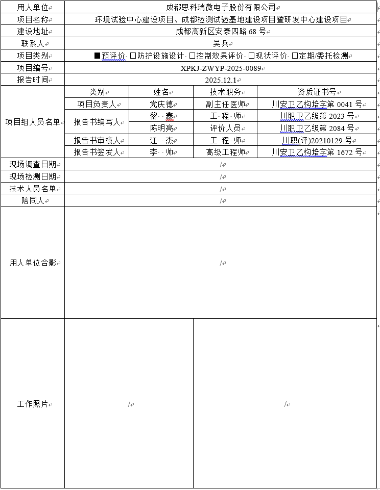 成都思科瑞微电子股份有限公司职业病危害预评价