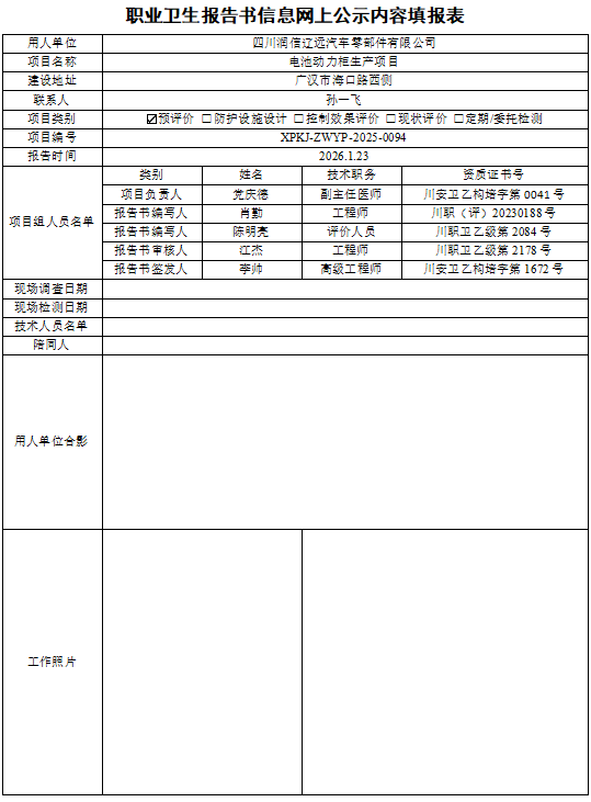 四川润信辽远汽车零部件有限公司职业病危害预评价