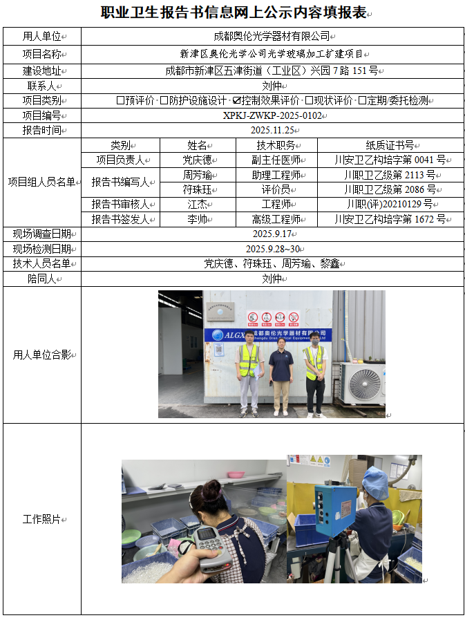 成都奥伦光学器材有限公司职业病危害控制效果评价