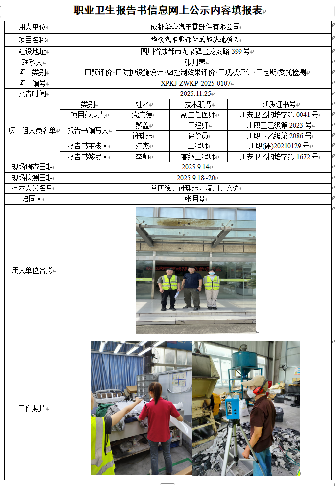 成都华众汽车零部件有限公司职业病危害控制效果评价