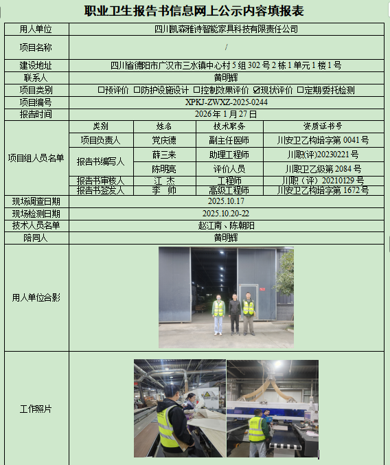 四川凯森雅诗智能家具科技有限责任公司职业病危害现状评价