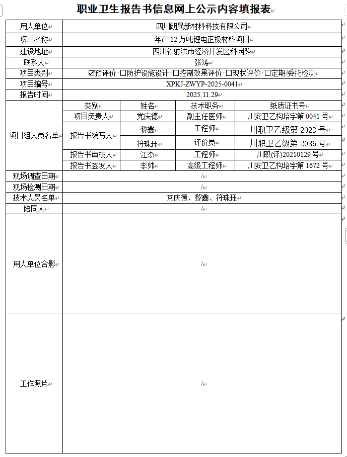 四川朗晟新材料科技有限公司职业病危害预评价