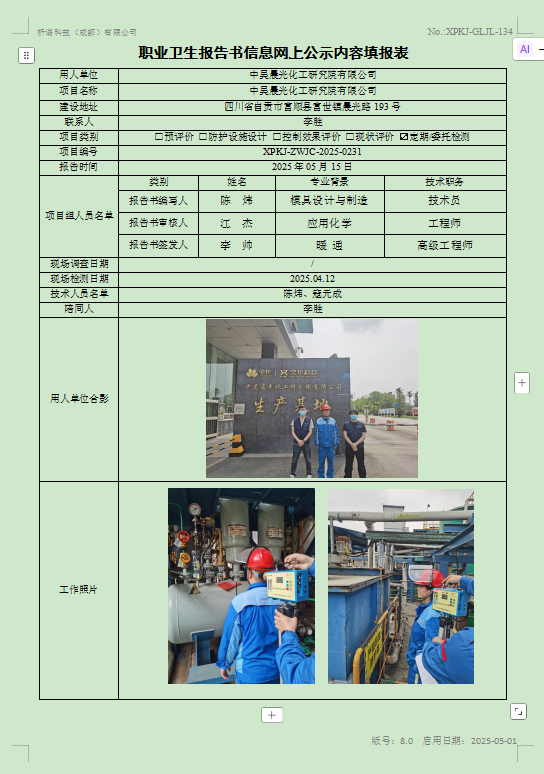 中昊晨光化工研究院有限公司职业病危害因素定期检测
